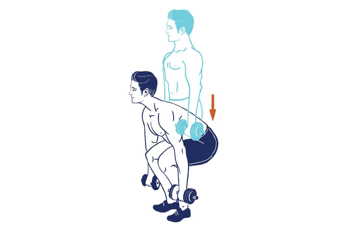 Для развития взрывной силы ног приседания с гантелями следует выполнять в особом стиле. Суть в том, чтобы медленно приседать в течение 3-4 секунд, а затем сделать взрывной подъем вверх.