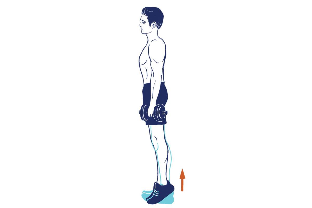 Более продвинутым спортсменам рекомендуем выполнять подъем на носок каждой ногой поочередно. В этом случае одной рукой держите гантель, а другой рукой возьмитесь за опору, чтобы сохранить равновесие.
