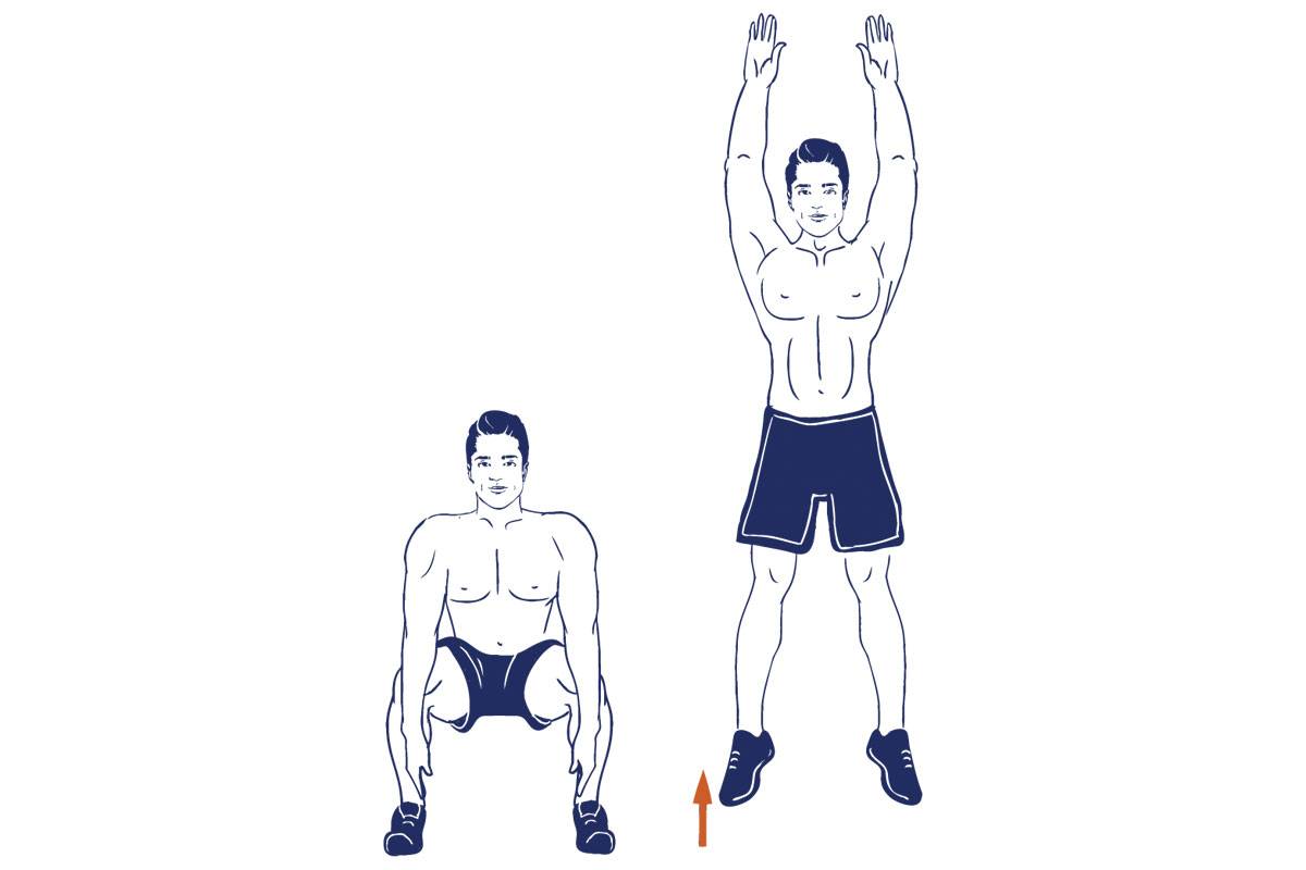 Исходное положение — поставьте ноги на ширине плеч, а носки слегка разверните в стороны. Держите вес тела на пятках. На вдохе сделайте приседание до параллели бедра с полом, а затем резким усилием выпрямляйте ноги и выпрыгивайте вверх. Чтобы прыгнуть выше сделайте взмах руками и тянитесь вверх. Спина должна оставаться в прямом положении по всей амплитуде движения