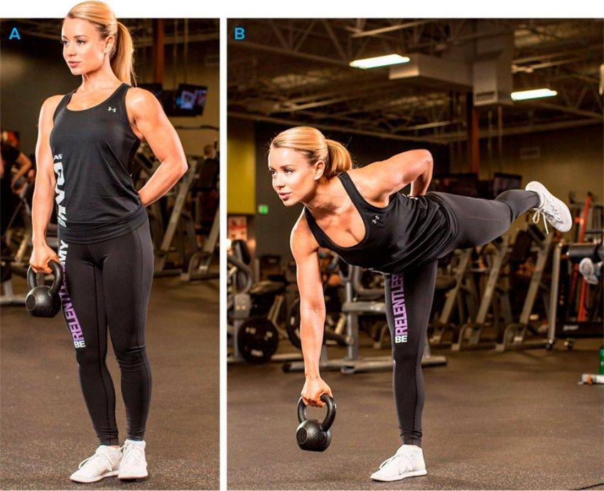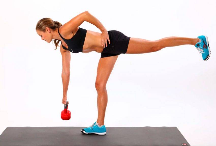 Это наиболее удобный вариант румынской тяги на одной ноге. Упражнение выполняется с одной или двумя гирями. Если с одной – лучше будет скрестный вариант, тяга на рабочей ноге, и удержание в противоположной руке;