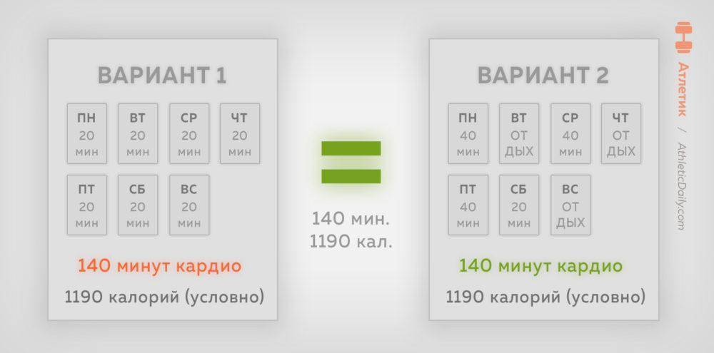 Вы можете тренироваться каждый день по 25 минут, а можете 3 дня в неделю по 60, разницы — никакой, так как общее время кардио у вас останется одно и тоже, соответственно и чисто гипотетически потратится одинаковое количество калорий.