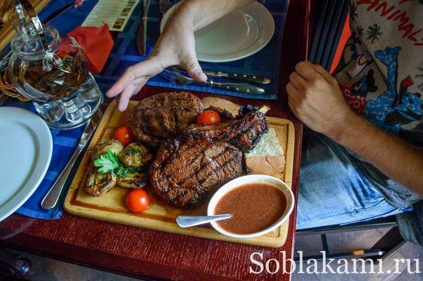 Самый дорогой счет в ресторане был 650 гривен ($30). Нам принесли 800 граммов сочного говяжьего стэйка, огромную тарелку с бараньими котлетами, картошкой и овощами.