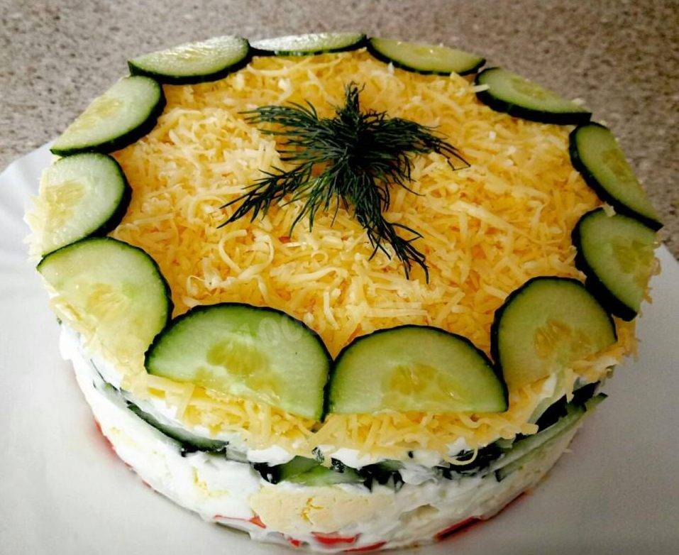- Подготовим остальные ингредиенты. 150 г свежих огурцов, крабовые палочки (300 г) измельчим кубиками; маслины (10 шт.) — колечками; сыр (170 г) и 4 вареных яйца натрем на терке.