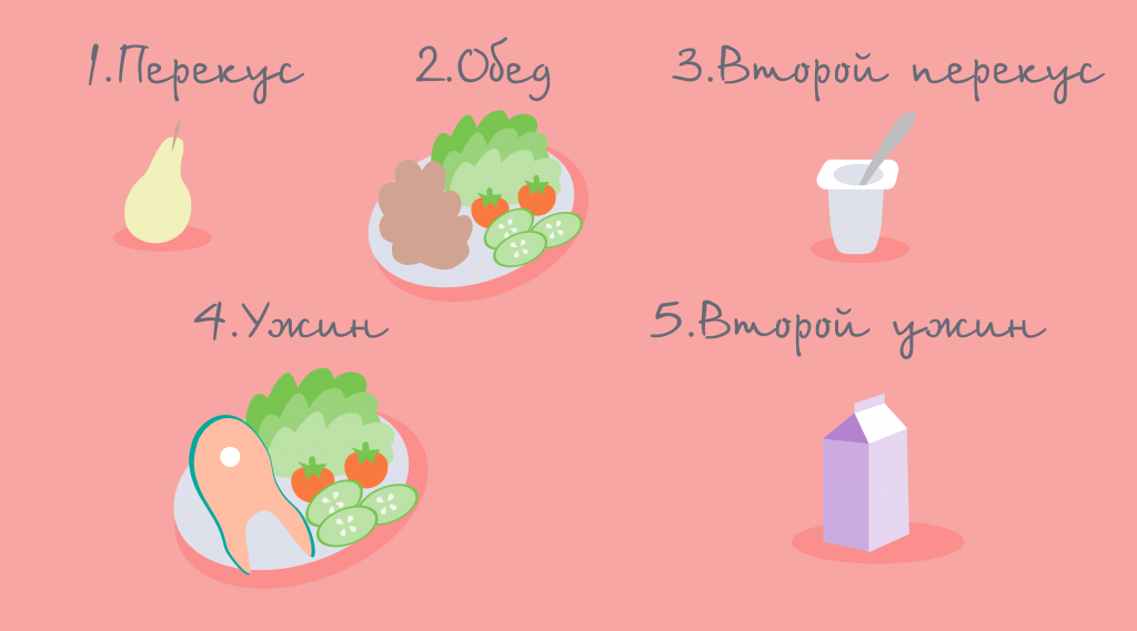Вы должны делать четыре приёма пищи: завтрак, обед, перекус, ужин. Временной промежуток между ними должен составлять четыре часа. Если сильно голодны, можно перекусить – выпить стакан кефира либо съесть несладкий фрукт.