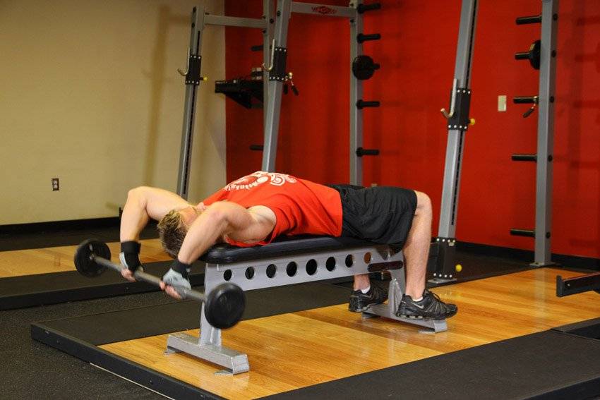 В положении лежа на тренировочной скамье руками беремся за штангу на ширине плеч и выталкиваем ее вверх. Фиксируем это положение. Далее необходимо аккуратно опускать ее за голову, до того момента, пока она не достигнет пола. Для того чтобы не травмировать сухожилия, необходимо держать локти в полусогнутом состоянии. После чего возвращаем штангу в изначальное положение.