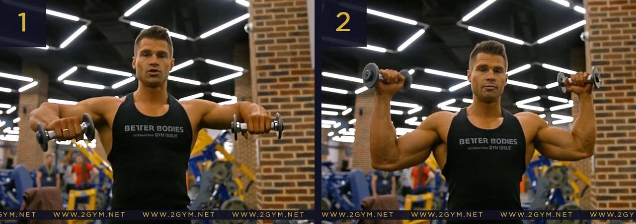 Можно выполнять упражнение как сидя, так и стоя. Руки в локтях слегка согнуты. При подъеме исключить рывки. Подъем должен быть плавным, а локти выше гантелей в верхнем положении. Если же гантели опережают локти, то необходимо взять весь отягощения меньше.