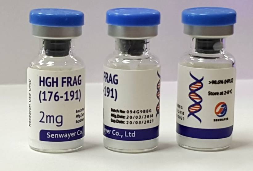 HGH Frag (176-191) (лабораторный шифр AOD9604) – стабилизированный фрагмент молекулы гормона роста со 176 аминокислоты по 191. Данный пептид стимулирует липолиз (сжигание жира) в 12 раз мощнее, по сравнению с гормоном роста и подавляет образование нового жира, при этом другие полезные и побочные эффекты гормона роста не обнаруживаются. HGH Frag (176-191) значительно дешевле ГР. Является одним из самых перспективных средств для лечения ожирения по мнению профессора Gary Wittert., а известная российская телеведущая Дана Борисова утверждает,что ей таким образом удалось похудеть на 30 кг.