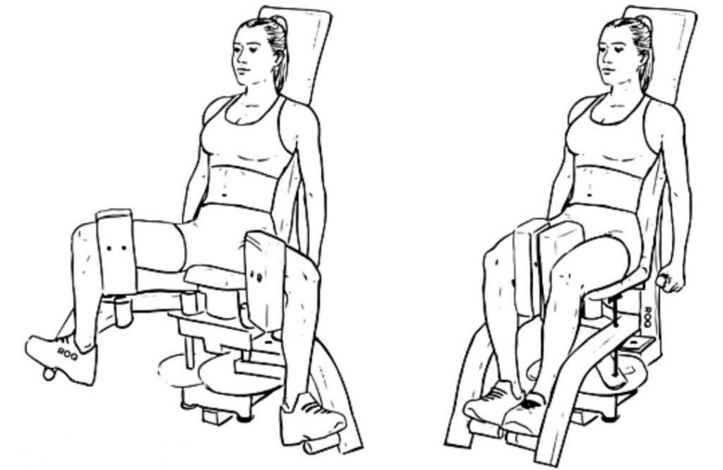 - Выпрямление ног в тренажере: 3 подхода по 6–15 раз