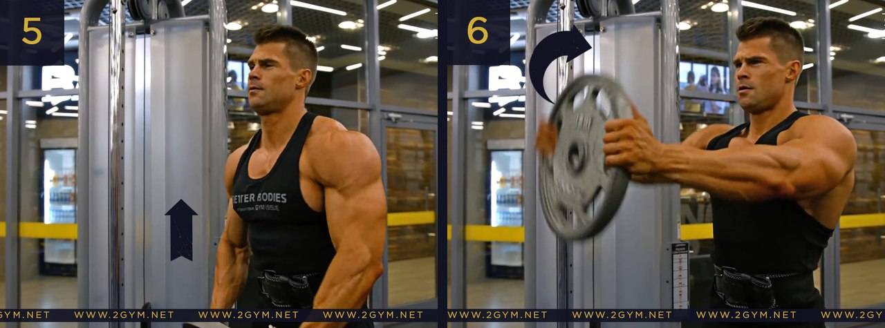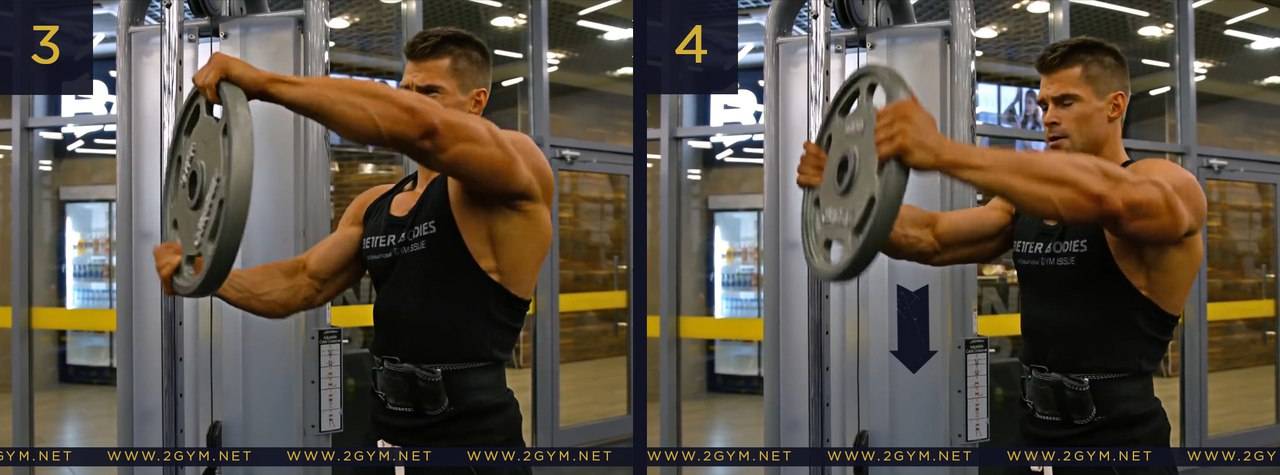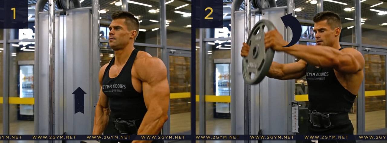 Следующая суперсерия нацелена на проработку передних дельт. Каждое упражнение выполняется в интервале 30-40 секунд, что соответствует 14-16 повторениям. Сделав запланированное количество подъемов блока, сразу без отдыха переходим к вращением блина перед собой.