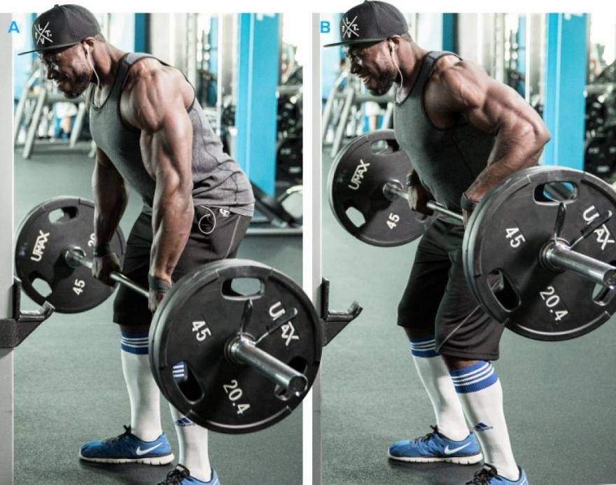 Исходная позиция: ноги, слегка согнутые в коленях, прогнутая поясница, корпус опускается на 90 градусов, в руках гантели, локти направлены вверх вдоль тела. Гантели поднимаются до максимального соединения лопаток, затем медленно, растягивая мышцы, опускаются вниз в первоначальную позицию.