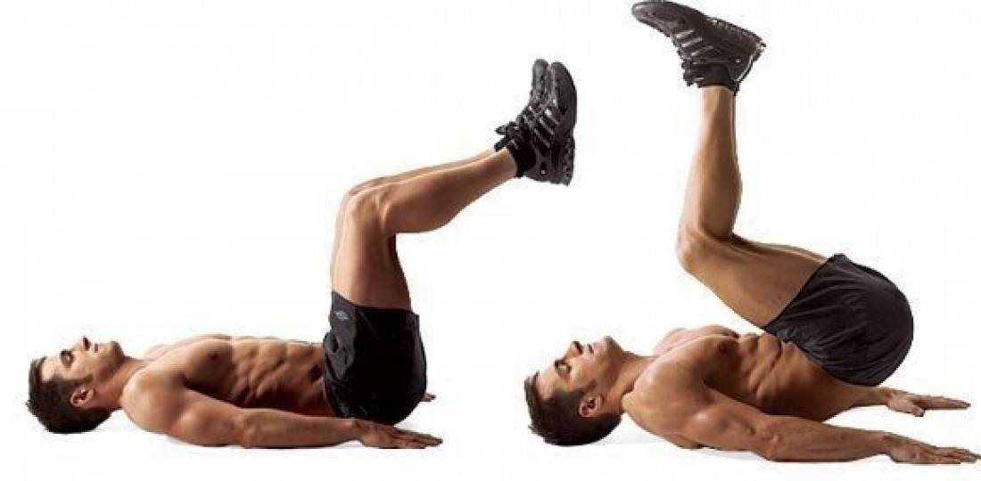 Исходное положение: лежа, спина прижата к полу, руки расположены вдоль тела ладонями вниз. Прямые ноги оторвать от пола на 15–20 см, произвести ними махи горизонтально или вертикально, имитируя работу ножниц. Выполняя упражнение, положение тела удерживают преимущественно мышцами живота.