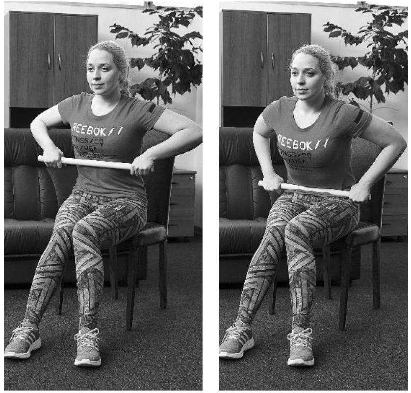 Исходное положение — сидя на стуле, туловище расположено вертикально, спина прямая. Массаж нужно проводить крупной круглой палкой, крепко зажав ее в ладонях. Движения — строго вертикально от диафрагмы до низа живота и обратно.