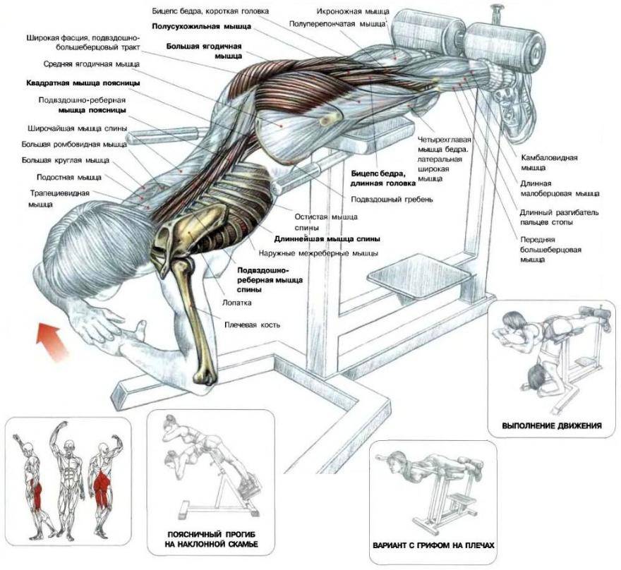 Гиперэкстензия (hyperextension) в переводе с английского — перерастяжение, переразгибание. Упражнение предназначено для укрепления мышц поясничного отдела. Основная нагрузка ложится на разгибатели спины, бицепсы бедер и ягодичные мышцы. В работу включаются мелкие спинные мышцы, которые не прорабатываются никакими другими упражнениями. Сильные мышцы поясницы очень помогают ускорить прогресс в таких базовых упражнениях, как становая тяга и других и быстрее накачать спину в тренажерном зале.