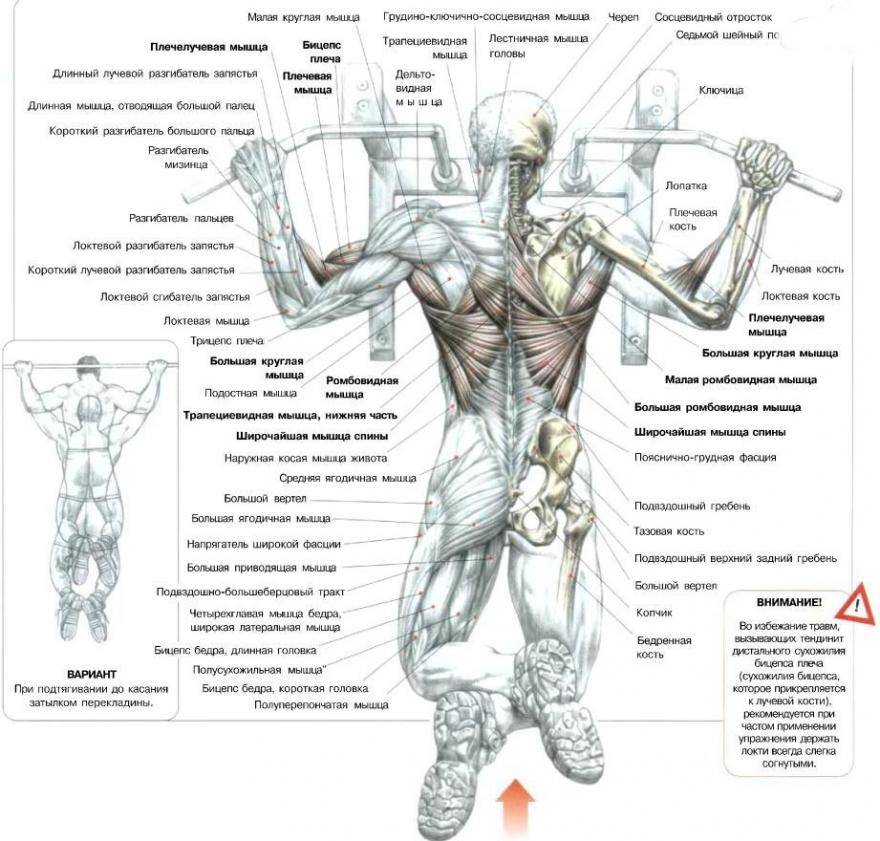 Ключевое упражнение для широчайших мышц спины, а также для прокачки мышц живота и рук — поскольку при правильном выполнении необходимо держать пресс в напряжении. Плюс подтягиваний заключается и в том, что за счет вариаций хвата оно позволяет качать все сегменты спины.
