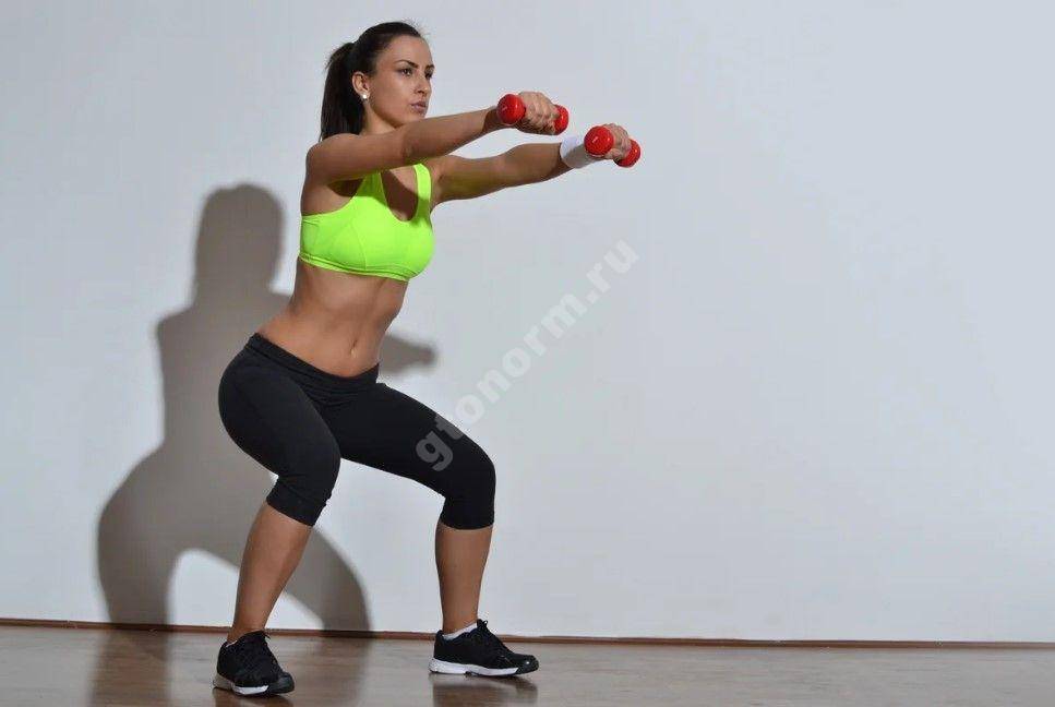 Приседаем либо до параллели бёдер с полом, либо чуть ниже.
