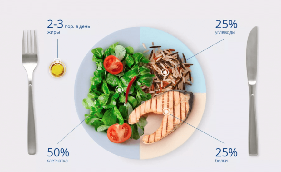 - Распределение БЖУ на тарелке. Необходимо знать, сколько можно кушать углеводов, белков и жиров за один присест. Помните, что овощей на тарелке должно быть 50%, белков и углеводов по 25%.