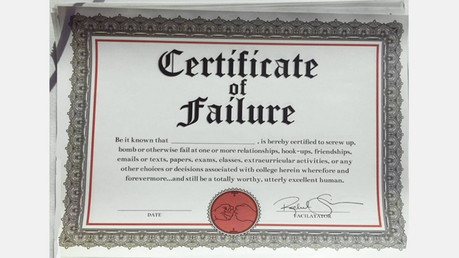 Среди участников акции была даже президент колледжа. Каждый студент и сотрудник мог создать собственное «резюме» и поделиться им с другими. Первым поделившимся выдали «сертификат провала» — напоминание, что его обладатель остаётся достойным и прекрасным человеком, даже если совершает ошибки и допускает провалы.