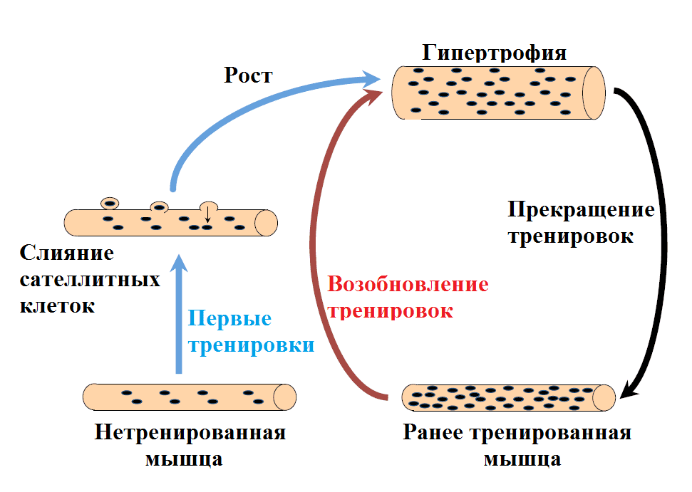 Исследования ученых показали, что после прекращения тренировок и атрофии мышц в течений нескольких месяцев, дополнительные ядра не исчезают, а просто снижают функциональную активность и пребывают в “режиме ожидания”. Учитывая данные результаты, можно заключить, что эти изменения являться долговременными. С возобновлением нагрузки дополнительные ядра (больше ядер – быстрее рост) начинают активно функционировать: усиливаются синтез белка и гипертрофические процессы, которые регулируются ядерными ДНК. В результате, восстановление (увеличение) мускульной массы, происходит в более короткие сроки.