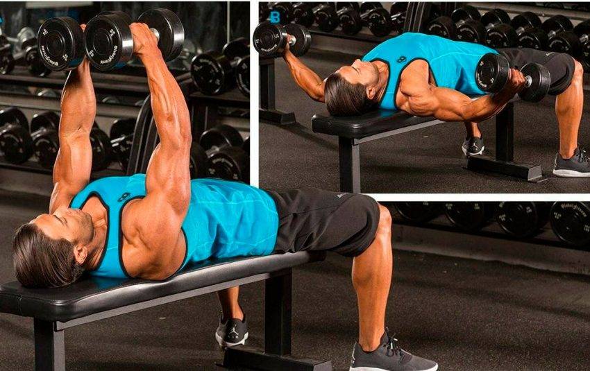 - Ложатся на горизонтальную скамью и поднимают над грудной клеткой гантели.