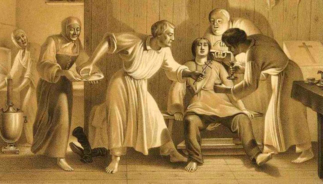 Поначалу кастрирование скопцов предполагало удаление яичек вместе с частью мошонки. Эти органы членам сект попросту отжигали каленым железом. Изуверский обряд именовали «огненным крещением». Позже для оскопления стали применять разного рода режущие инструменты, а прижигание использовали для остановки кровотечения и дезинфекции.