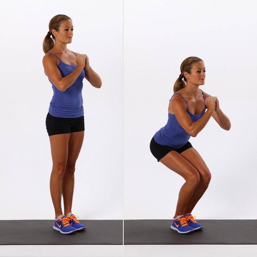 Первое и самое простое упражнение, которое известно буквально каждом – классические приседания. Однако, при неправильном выполнении можно получить травму колена. Чтобы этого избежать, придерживайтесь этого алгоритма: