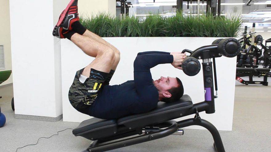 - Скручивания на наклонной поверхности. Тело нужно выпрямить и тянуться локтями вверх. Скручивания делают на наклонной скамье.