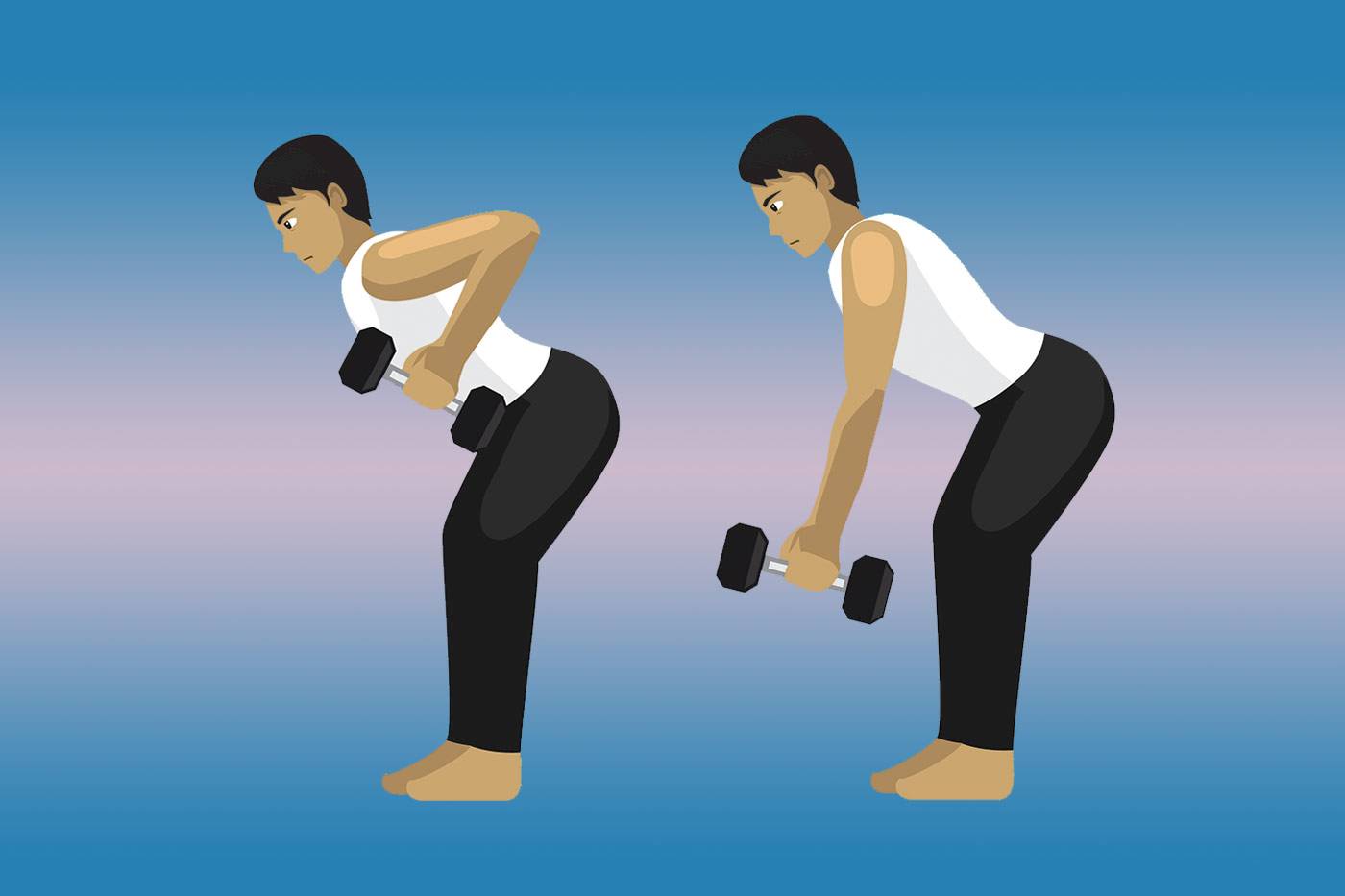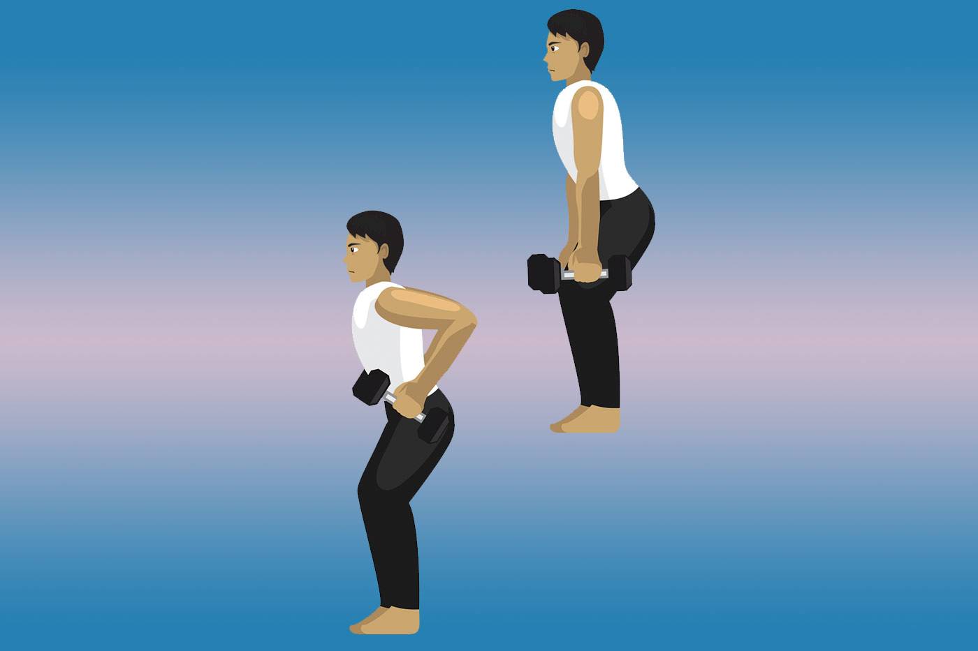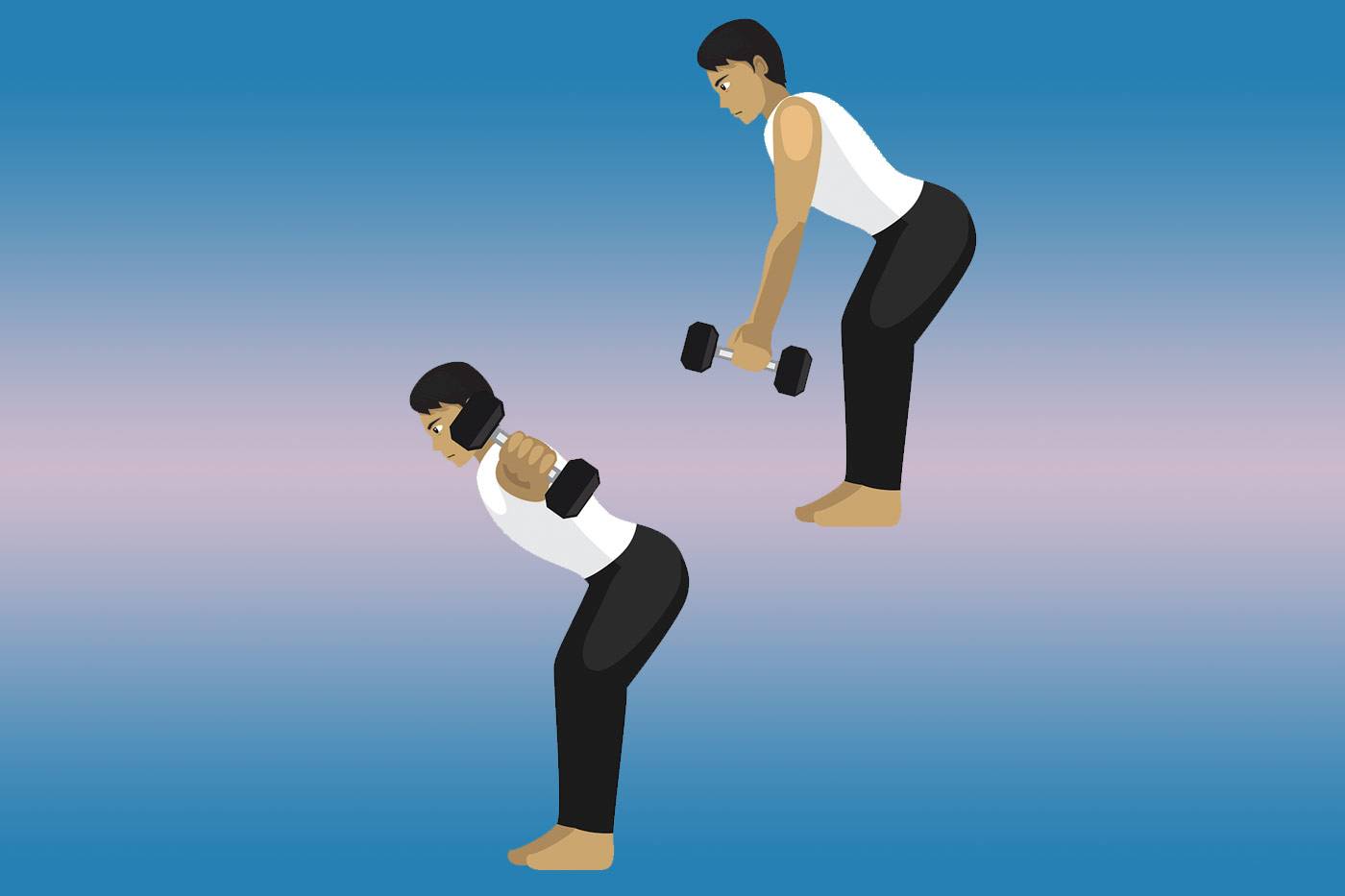 Наклонившись вперёд и взяв в руки гантели, на выдохе распрямите корпус и поднимитесь вверх — основная нагрузка приходится на низ спины и на мышцы-разгибатели позвоночника.