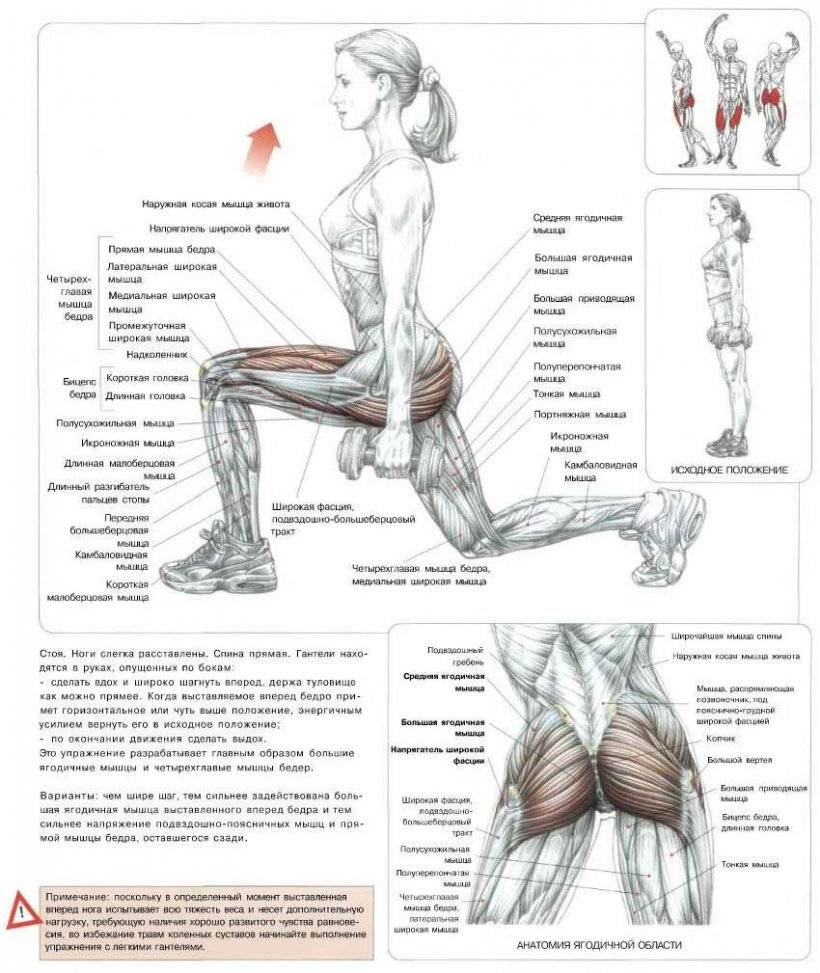 После того, как вы освоите это движение, начинайте параллельно работать руками: при выпаде подтягивайте гантели к груди, а затем опускайте их в нижнее положение. Локти следует держать прижатыми к поясу.
