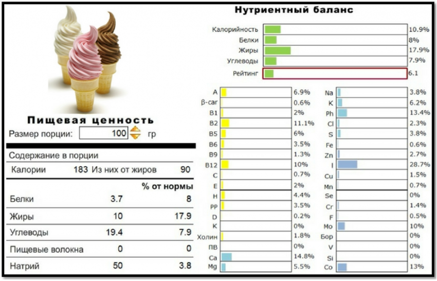 Во-первых, мороженое является отличным источником кальция. А этот микроэлемент принимает непосредственное участие в процессе сжигания жиров. Проводились даже специальные эксперименты, которые доказали, что люди худели на 30% больше в том случае, если регулярно употребляли дополнительные порции кальция. Для полноценного обмена веществ в сутки должно поступать 1200 мг этого микроэлемента, что равняется 3 — 4 порциям молочных продуктов с минимальным содержанием жира.