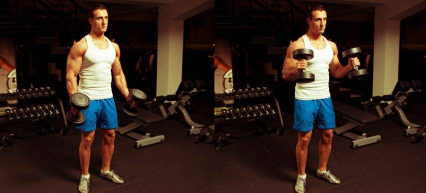 Подъемы гантелей с хватом «молоток» на бицепс