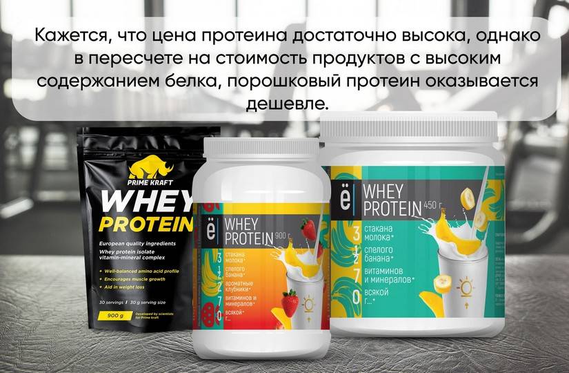 Цена. С первого взгляда кажется, что цена, например, протеина достаточно высока. Однако в пересчете на стоимость продуктов с высоким содержанием белка порошковый протеин оказывается дешевле.
