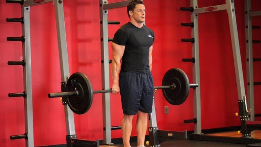 - начать подъем вверх, держа штангу на выпрямленных руках сзади;