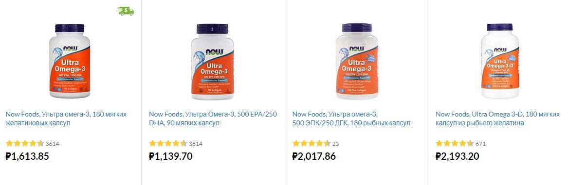 | Ultra Omega 3 500 EPA, 250 DHA | Отличается повышенным содержанием ПНЖК – 750 мг на капс. По необходимости выпивают две, тогда порция будет 1,5 г. Капсулы из бычьего желатина. |