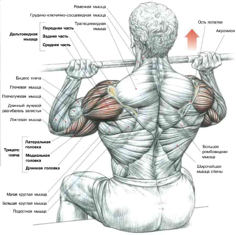 В верхней части спины находятся трапециевидные мышцы, которые не стоит перегружать без особой надобности, т.к. их перекачивание приводит к сужению плеч. Основной упор необходимо сделать на широчайшие мышцы.