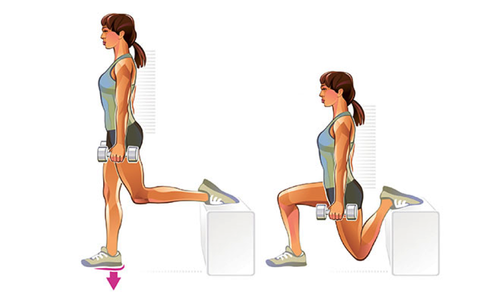 | Выпады. Возьми в руки гантели (можно без них), стань прямо, ноги поставь чуть уже ширины плеч. Шагни вперед и присядь, пока бедро не станет параллельно полу. Плечи при этом расправлены, а руки опущены. Вернись в первоначальное положение. Так по 8-12 повторений на каждую ногу. |