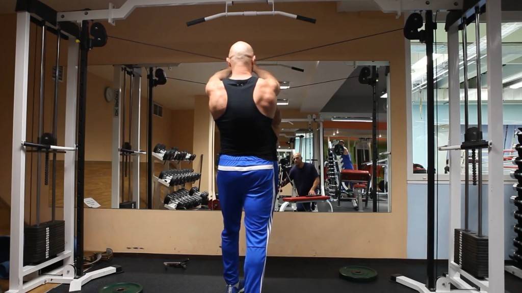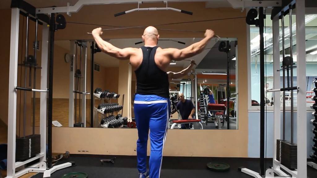 В работу могут включаться широчайшие мышцы спины и трицепсы, в связи с этим для достижения точечной нагрузки мы используем различные тренажеры. Первые два упражнения мы выполняли в машине Смита, третье мы будем выполнять у верхнего блока кроссовера (тросового тренажера).
