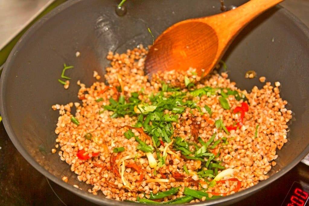 - Жареная гречка становится красивого темно- или светло-коричневого цвета и приобретает ореховый аромат.