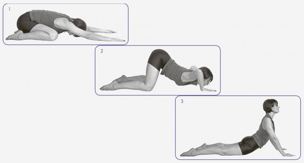 Один из вариантов – упражнение «Кошка». Прогибайтесь, как будто пытаетесь проползти под низким препятствием. Начинаем вперед, прогибаем грудной отдел, затем переносим тело немного вперед и прогибаемся уже в пояснице, поднимая грудь. Теперь то же самое – назад.