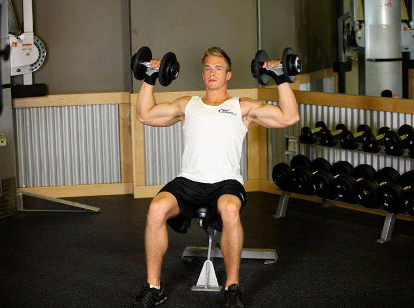 Выполняется обычный жим сидя с весом, который составляет 60% от рабочего или чуть выше. Допустим, 12 повторений вы делаете с весом 25 кг, на выносливость работайте с 12-15 кг. Нужно делать примерно 25 повторений в подходе, и работать с отдыхом в 30-60 секунд между сетами. Количество подходов – не менее 4.
