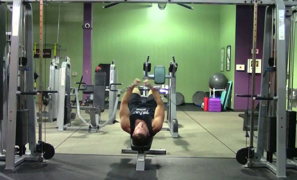 - Аналогично жиму лежа прижмите к скамье ягодицы, плечи и голову, сделайте легкий прогиб в пояснице и упритесь ногами в пол.