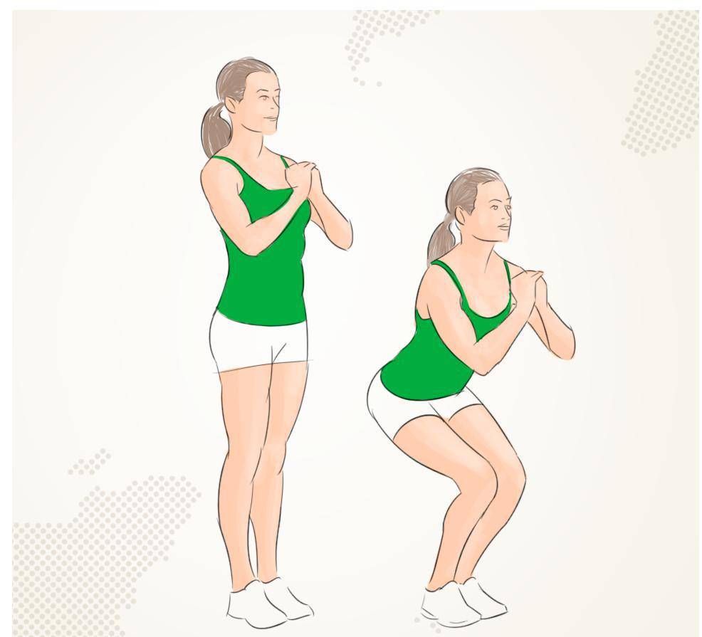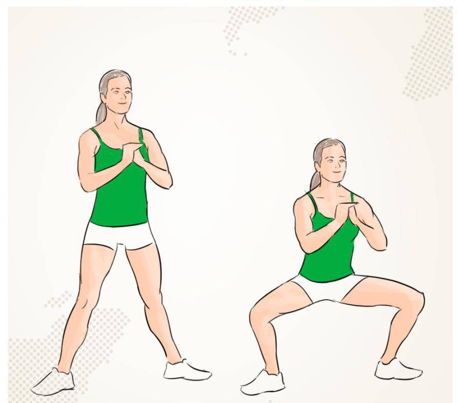 - Приседания сумо: выполняются они с широко расставленными ногами, носки стоп должны смотреть наружу, руки расположены вместе на груди. При выполнении приседаний спина должна быть прямой.