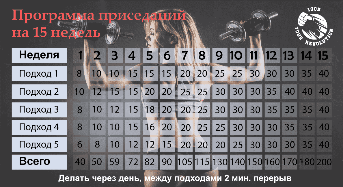 Приседания для похудения следует выполнять 3 раза в неделю, между тренировками нужно выделять день для отдыха. Итак, сама программа расписана на недели и следующее количество приседаний:
