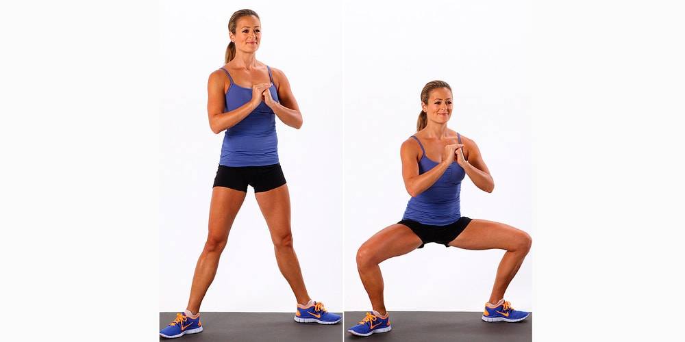 - выполнить приседание идентично базовому, держа спину ровной и сохраняя прогиб в пояснице, пятки прижать к полу.