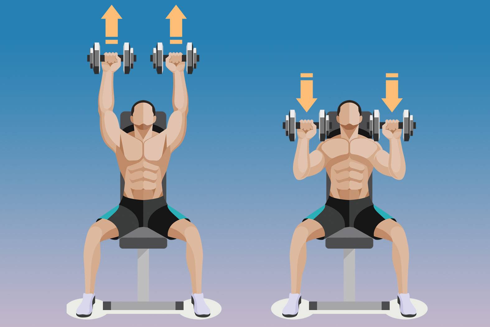 - Поднять чуть согнутые в локтях руки так, чтобы гантели располагались над плечами.