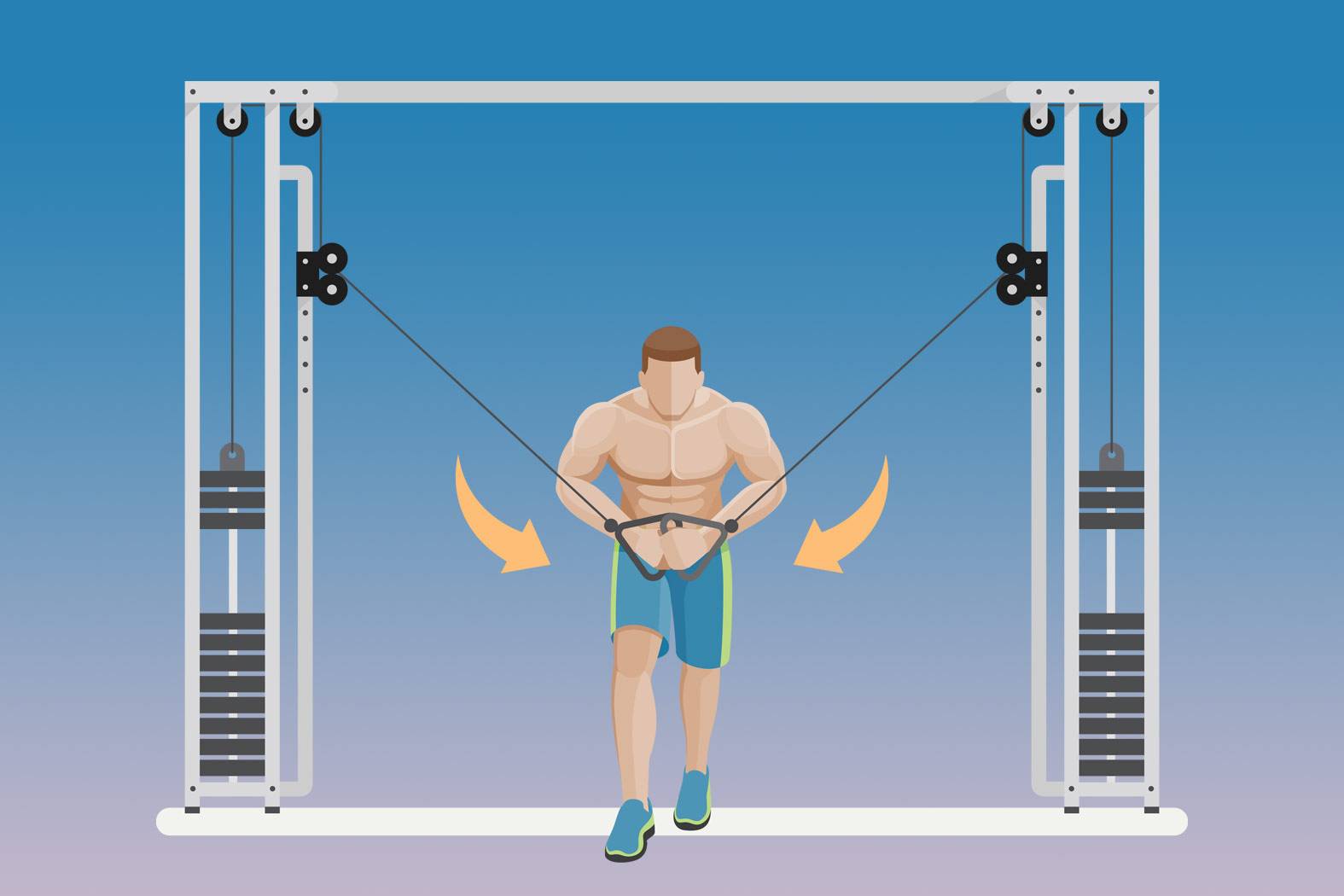 Сведение рук на блоках позволяет проработать внутреннюю часть и низ грудных мышц.