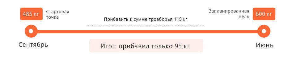 Общий итог: за 10 месяцев тренировок по русскому циклу — прибавка к сумме троеборья 95 кг.