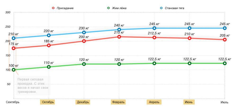 Приседание – 212,5 кг Жим лёжа – 122,5 кг Становая тяга – 245 кг