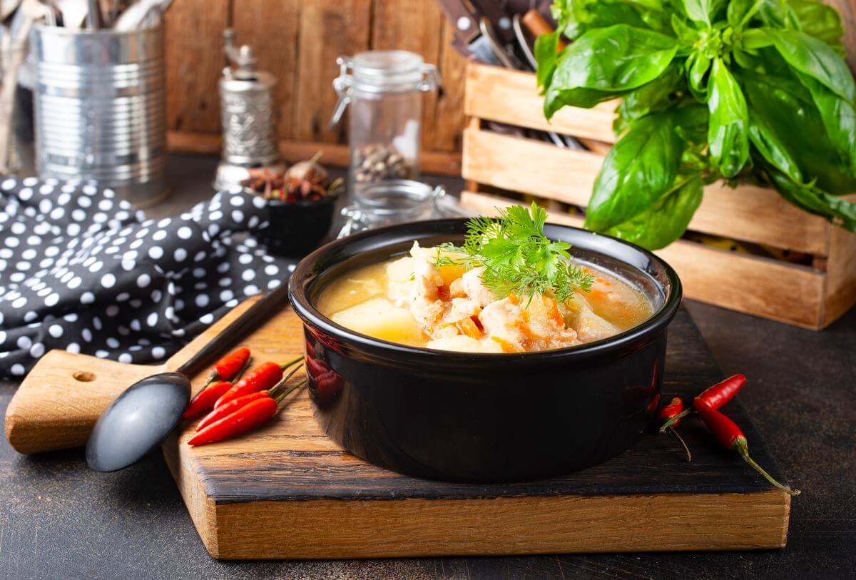Сварить на медленном огне бульон с курицей. Тыкву и картофель порезать кубиками, лук — полукольцами, добавить поочередно в кастрюлю. Томаты, перец и морковь пассировать на растительном масле 10 минут. Положить в бульон, когда овощи станут мягкими. Посолить, всыпать несколько щепоток измельченной зелени, лавровый лист. Готовый суп настоять 20 минут.