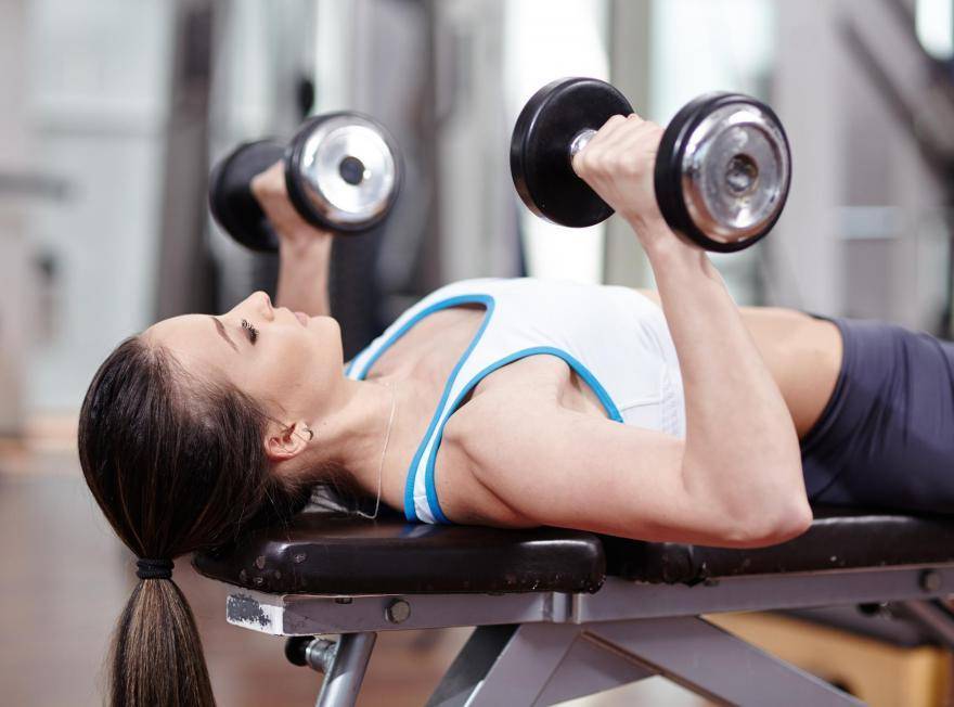 - Опуститесь спиной на «скамейку» и поднимите гантели над грудью.