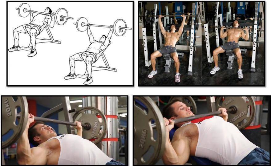 - Жим штанги с обратным наклоном. Выполняют так же, как и предыдущее упражнение. Снаряд нужно держать на широкой позиции, чтобы активировать нижние мышцы груди. Количество повторов сокращают до 8 в 3-4 подхода.